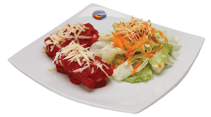 Deliciosa panqueca com recheio de carne, servida ao molho de tomate e acompanhada de uma saladinha