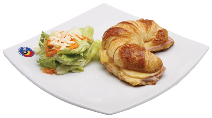Tradicional sanduíche quente no pão croissant com recheio de presunto, requeijão, queijo prato, tomate e manjericão