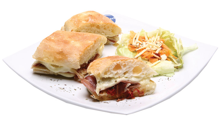 Irresistível sanduíche quente no pão ciabatta com recheio de presunto tipo parma, requeijão, mozarela, tomate seco e manjericão