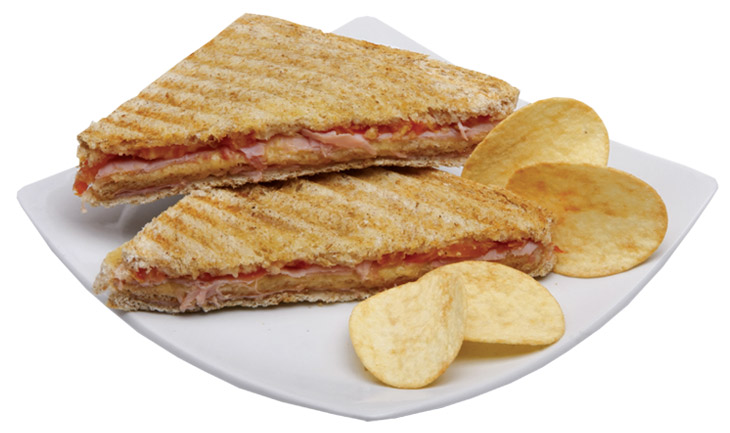 Pão de forma, peito de peru, queijo e tomate
